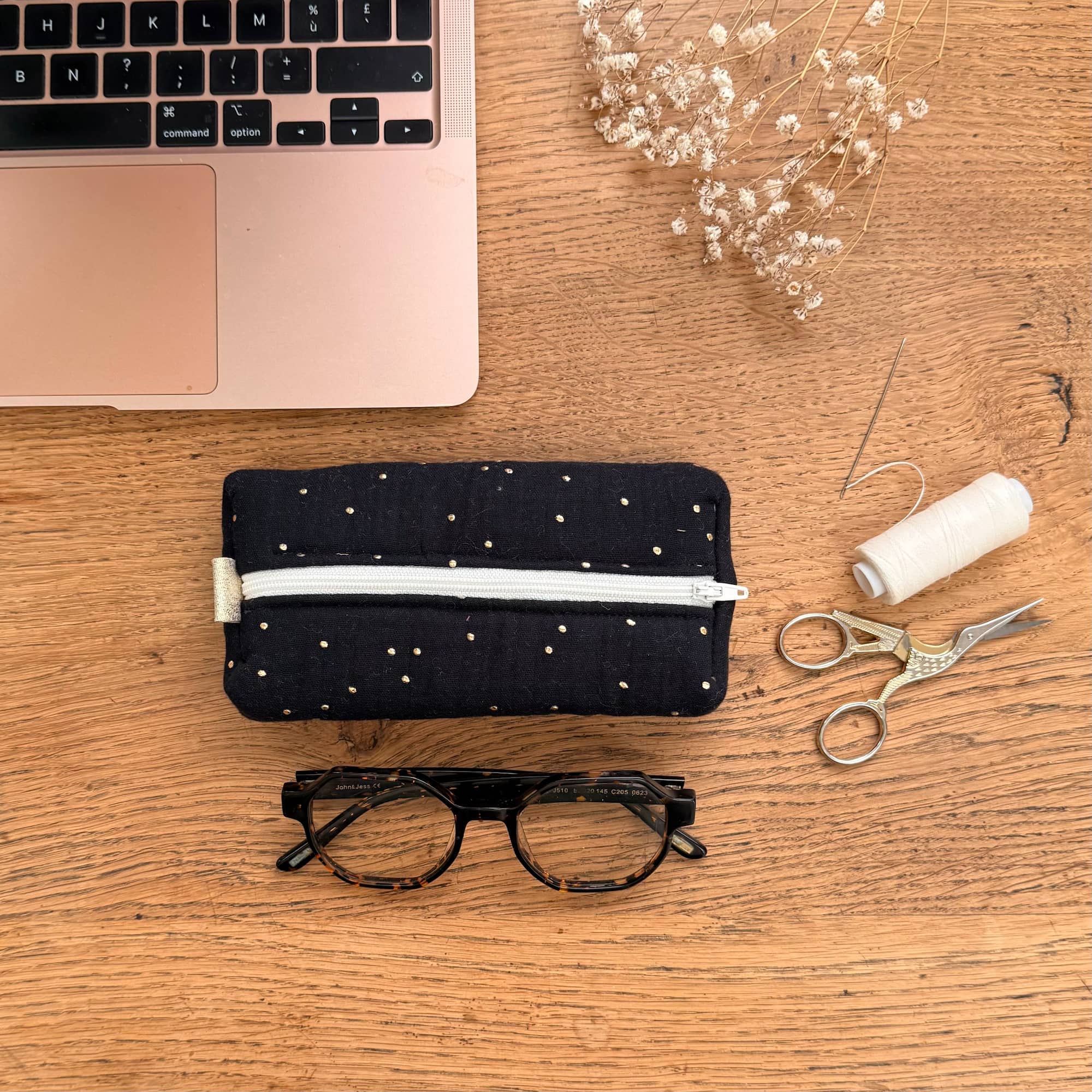 Confectionnée en double gaze de coton à pois dorés, elle séduit par son toucher délicat, sa légèreté et son élégance subtile. Son rembourrage moelleux protège efficacement vos lunettes des petits choses du quotidien, que ce soit dans un sac à main, un cartable ou une valise.